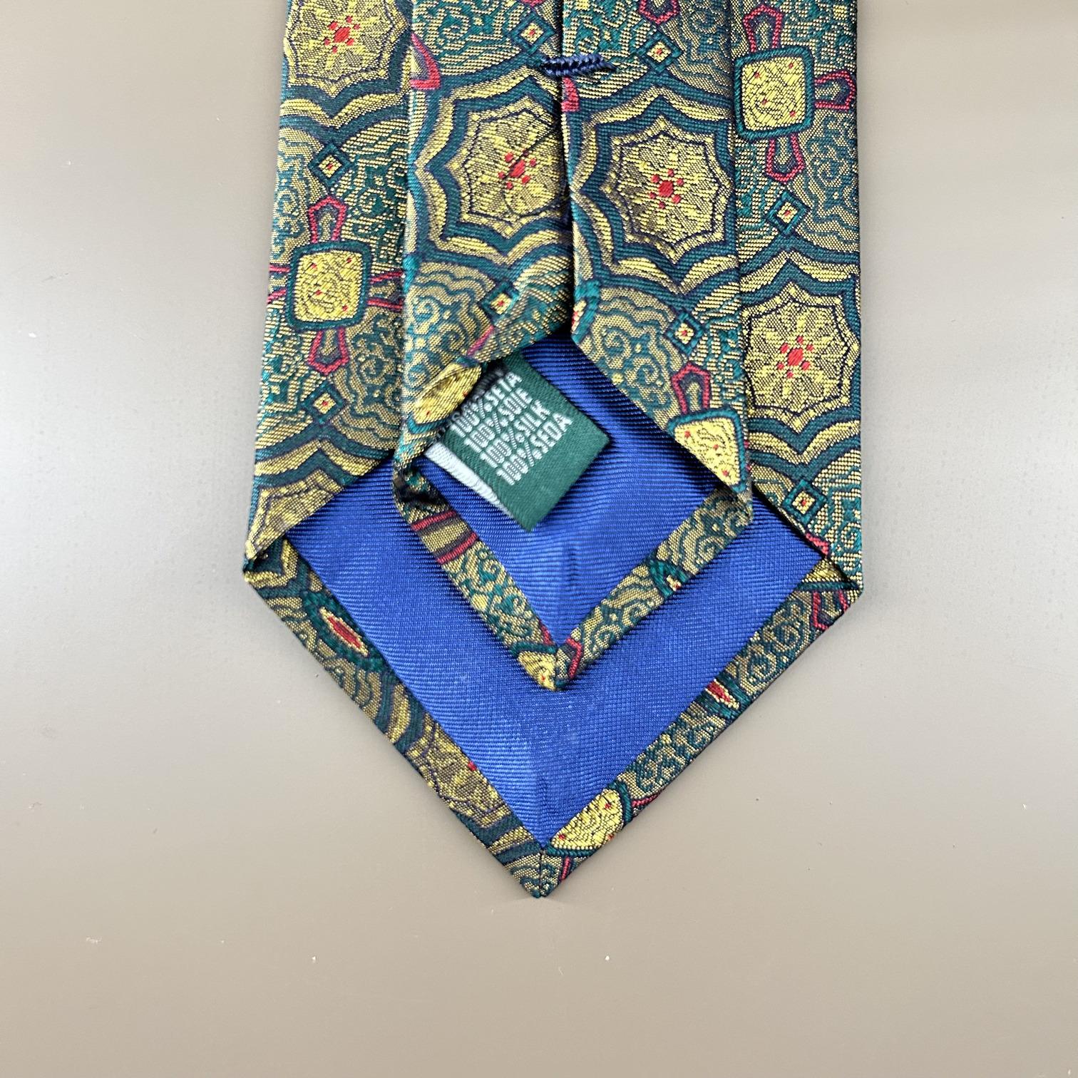 Green, gold, and maroon patterned tie in blue, 100% silk, a tie of excellent quality. Suitable for any season.