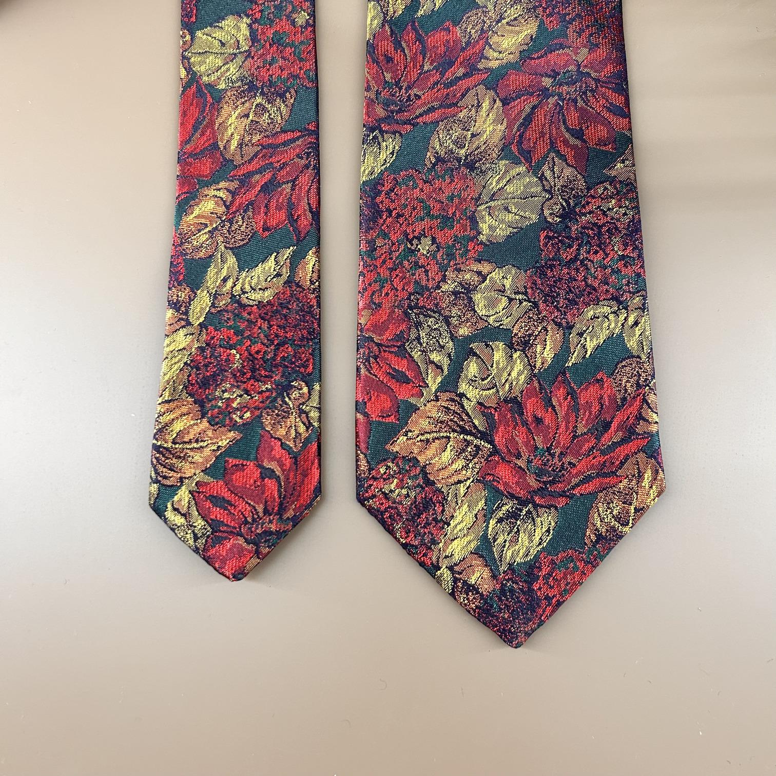 Floral tie in green, red, and gold jacquard made from 100% silk, a high-quality tie. Suitable for any season.