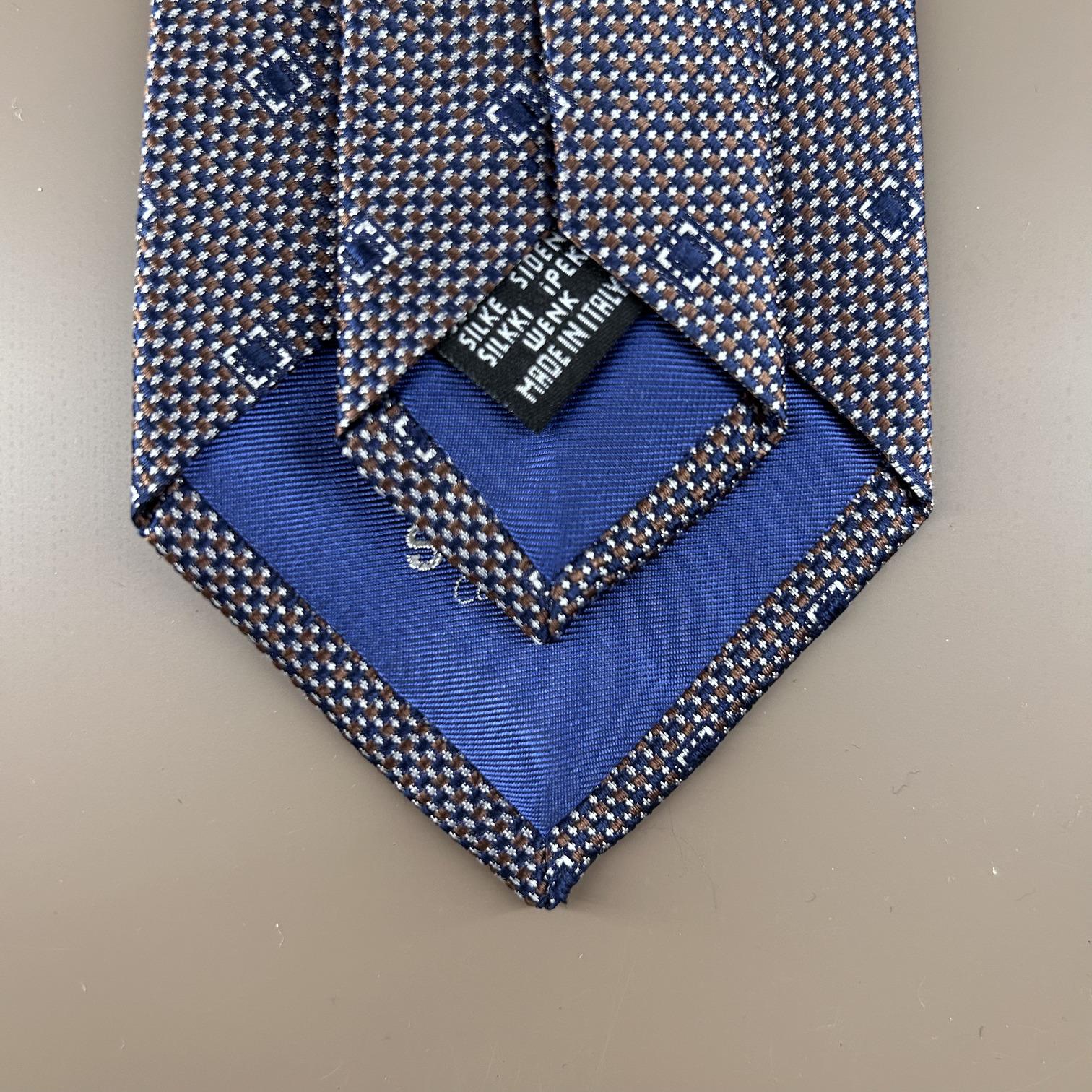 Navy blue, brown, and white polka dot tie in 100% silk jacquard, a high-quality tie. Suitable for any season.
