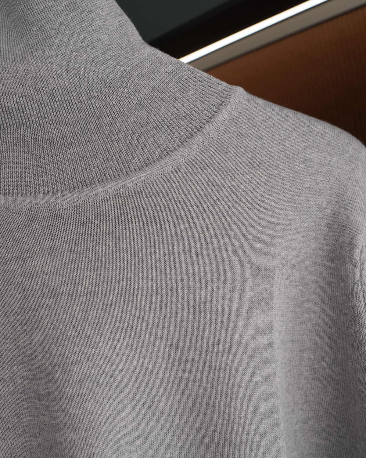 Elegante jersey gris de punto fino confeccionado en lana Merino 100% , un tejido de máxima calidad que garantiza suavidad, transpirabilidad y durabilidad.