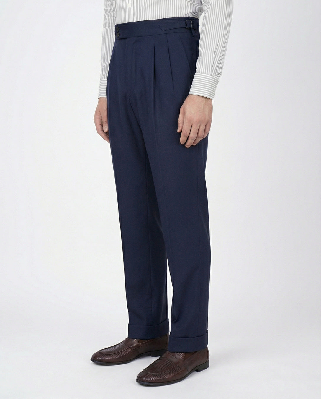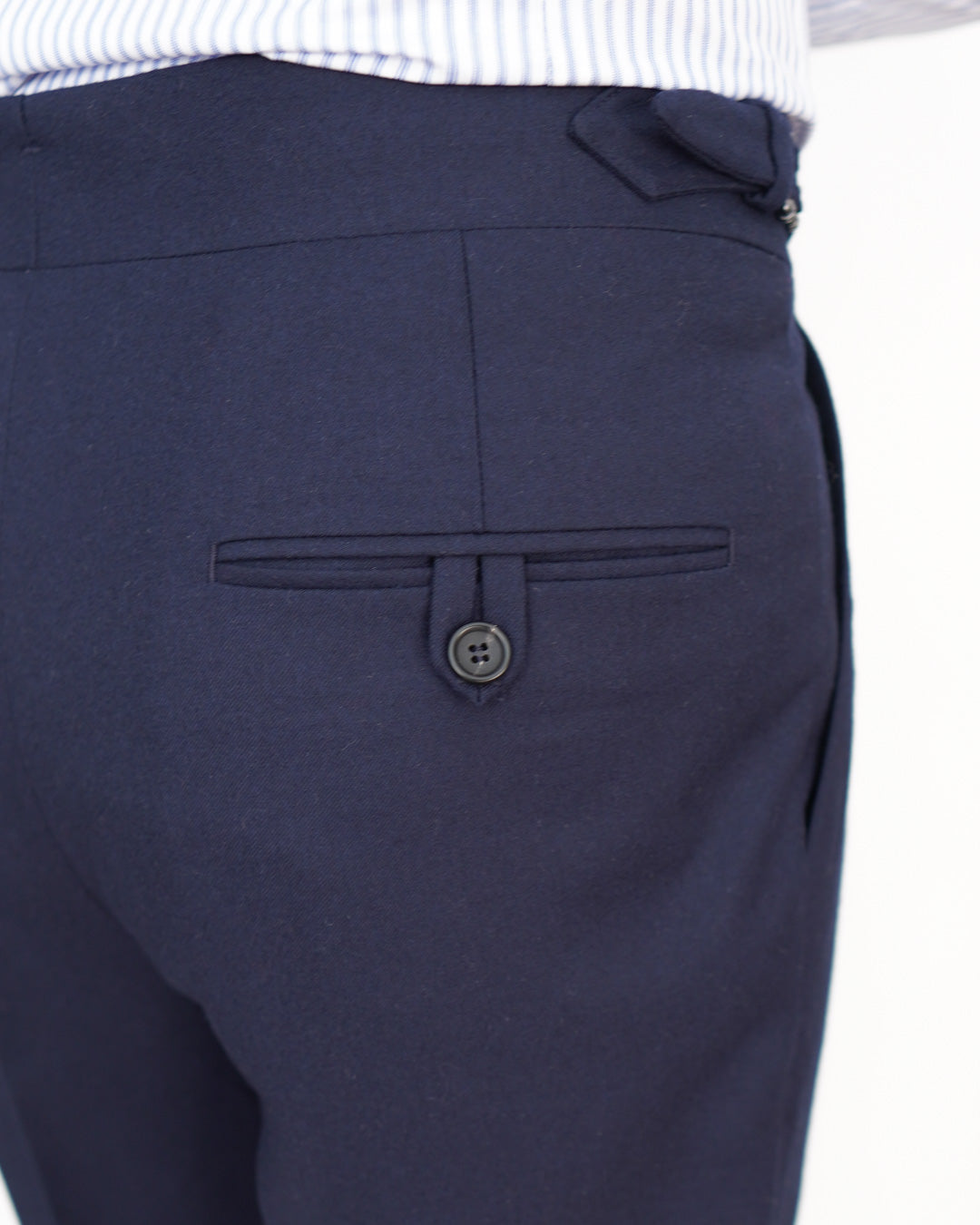 Pantalón azul marino de vestir de líneas sartoriales, el corte con un ligero talle alto se ajusta de manera muy cómoda, la lana pura es una fibra natural que hace que el pantalón sea fluido, ligero y suave al tacto.