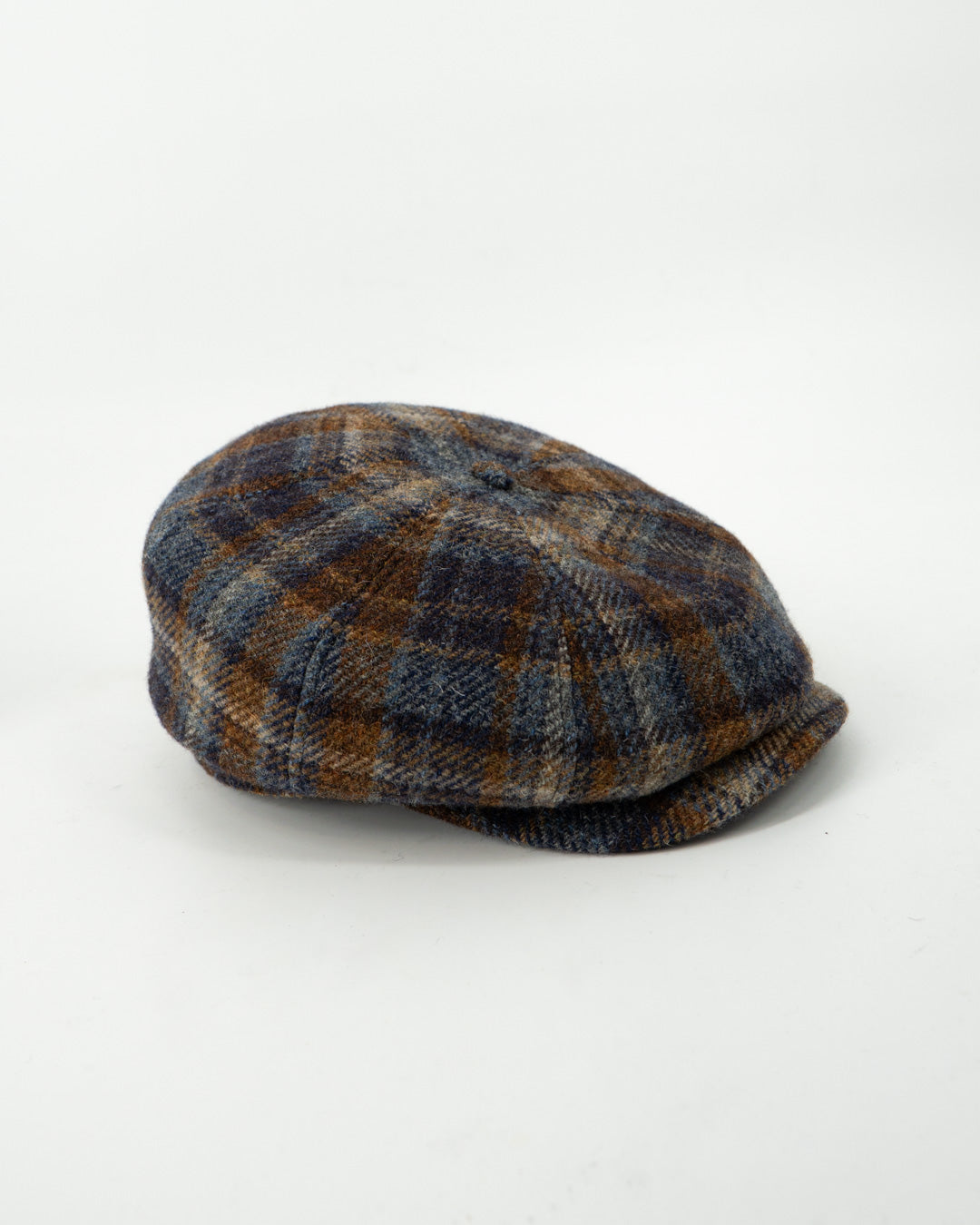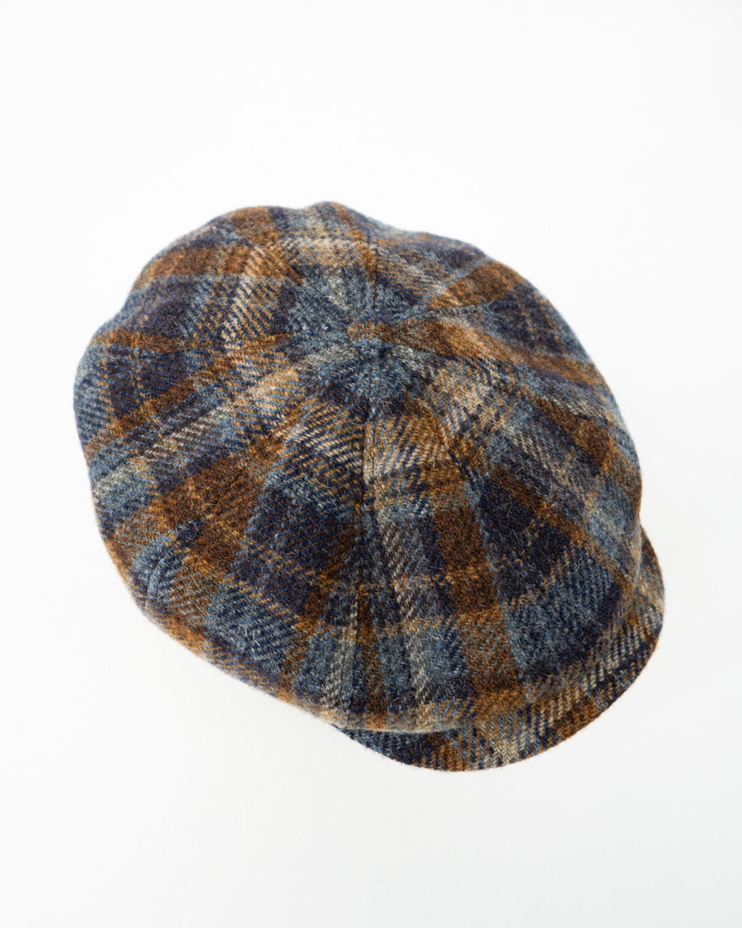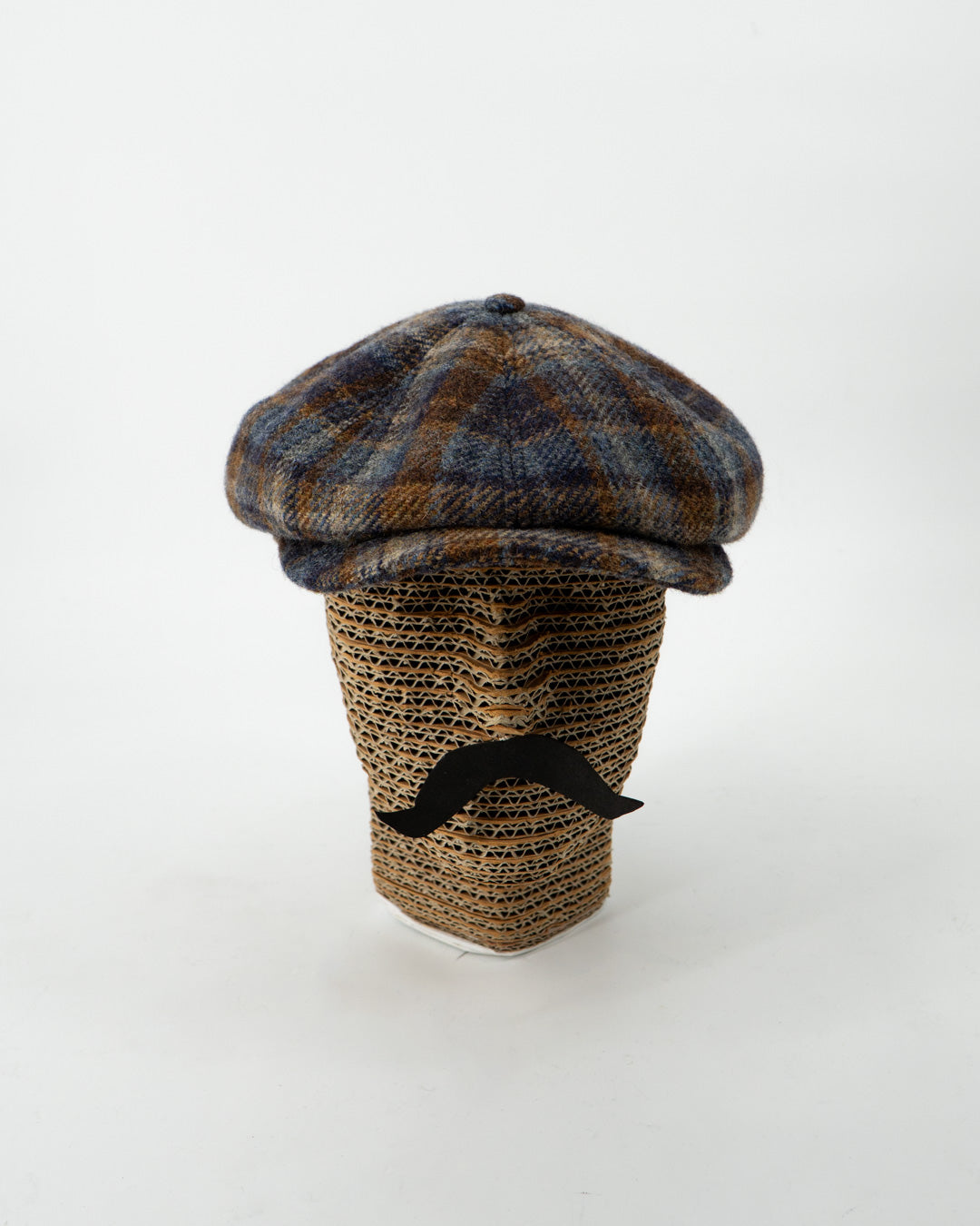 Gorra estilo Hattera de tartán en tonos azules y marrones, destaca por su forma redondeada con vuelo y un botón arriba, del cual salen los 8 gajos que la componen. Gorra tipo Peaky Blinders, ideal para otoño/invierno. Una gorra vintage que aporta estilo además de ser práctica y ligera.