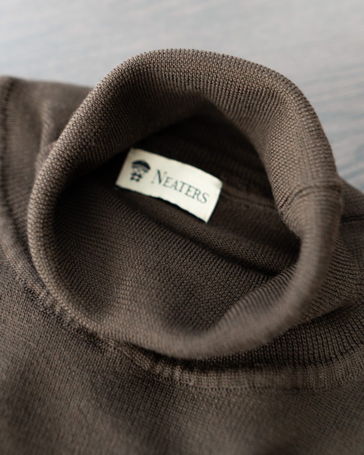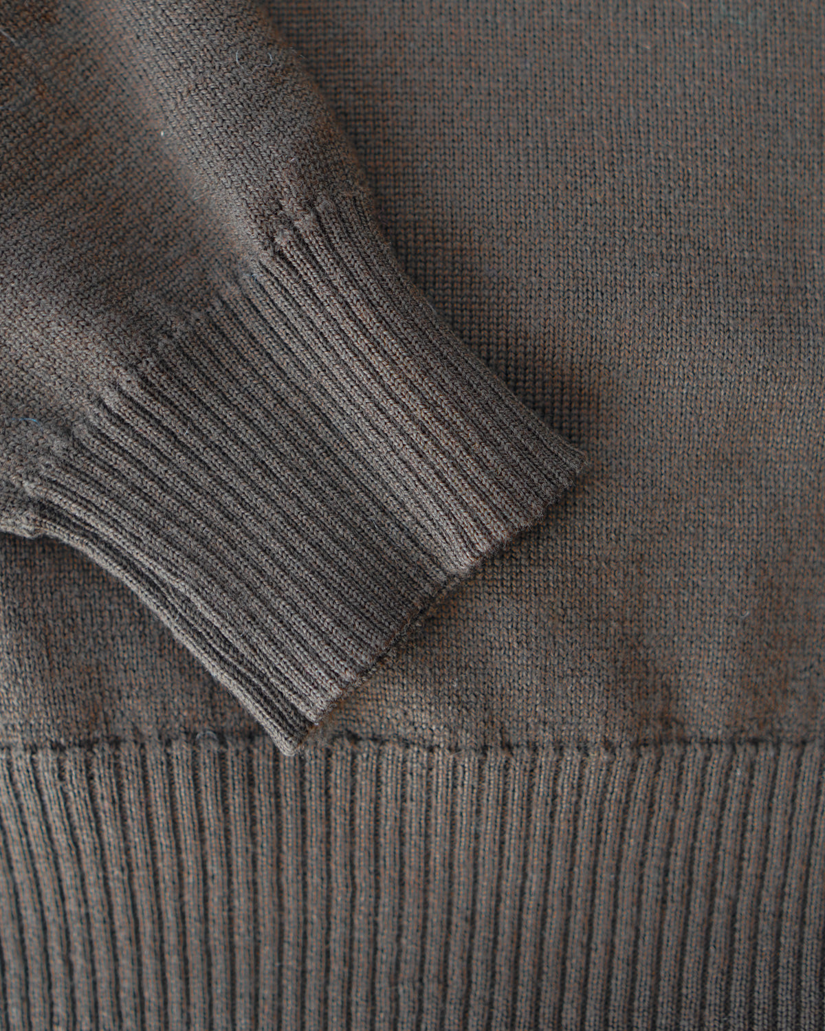 Elegante jersey marrón de punto fino confeccionado en lana virgen 100% natural, un tejido de máxima calidad que garantiza suavidad, transpirabilidad y durabilidad.